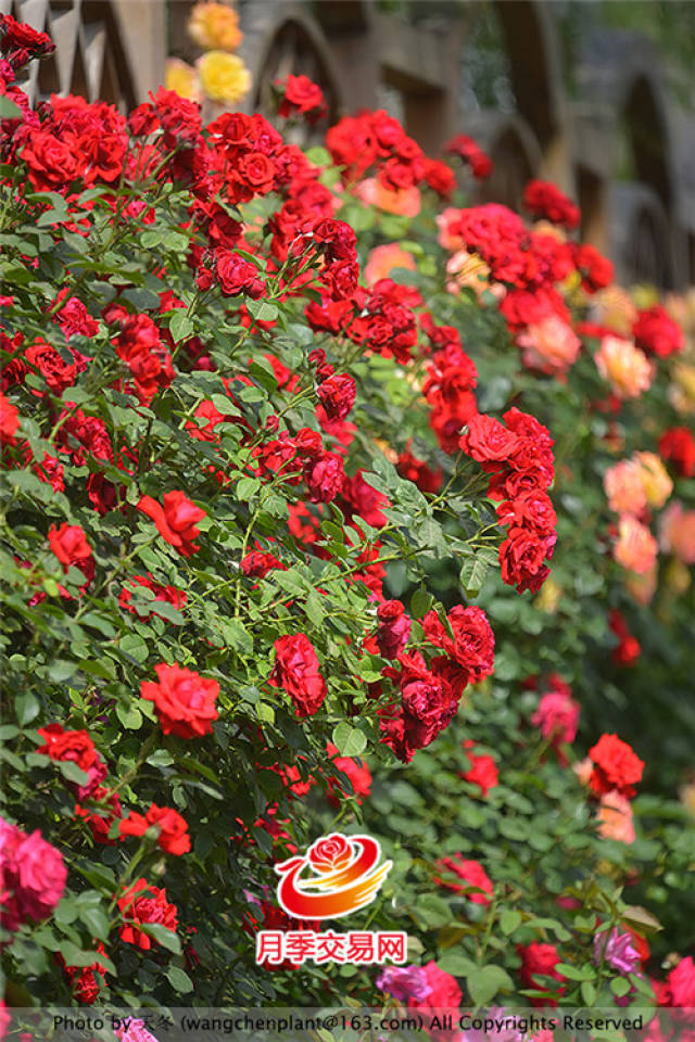 墙体彩化一般运用盘圆或者铺贴式方法将花卉植物装饰在建筑物的外墙和各种围墙的一种立体彩化方式,月季花中的攀爬藤本月季是优选彩化花卉。